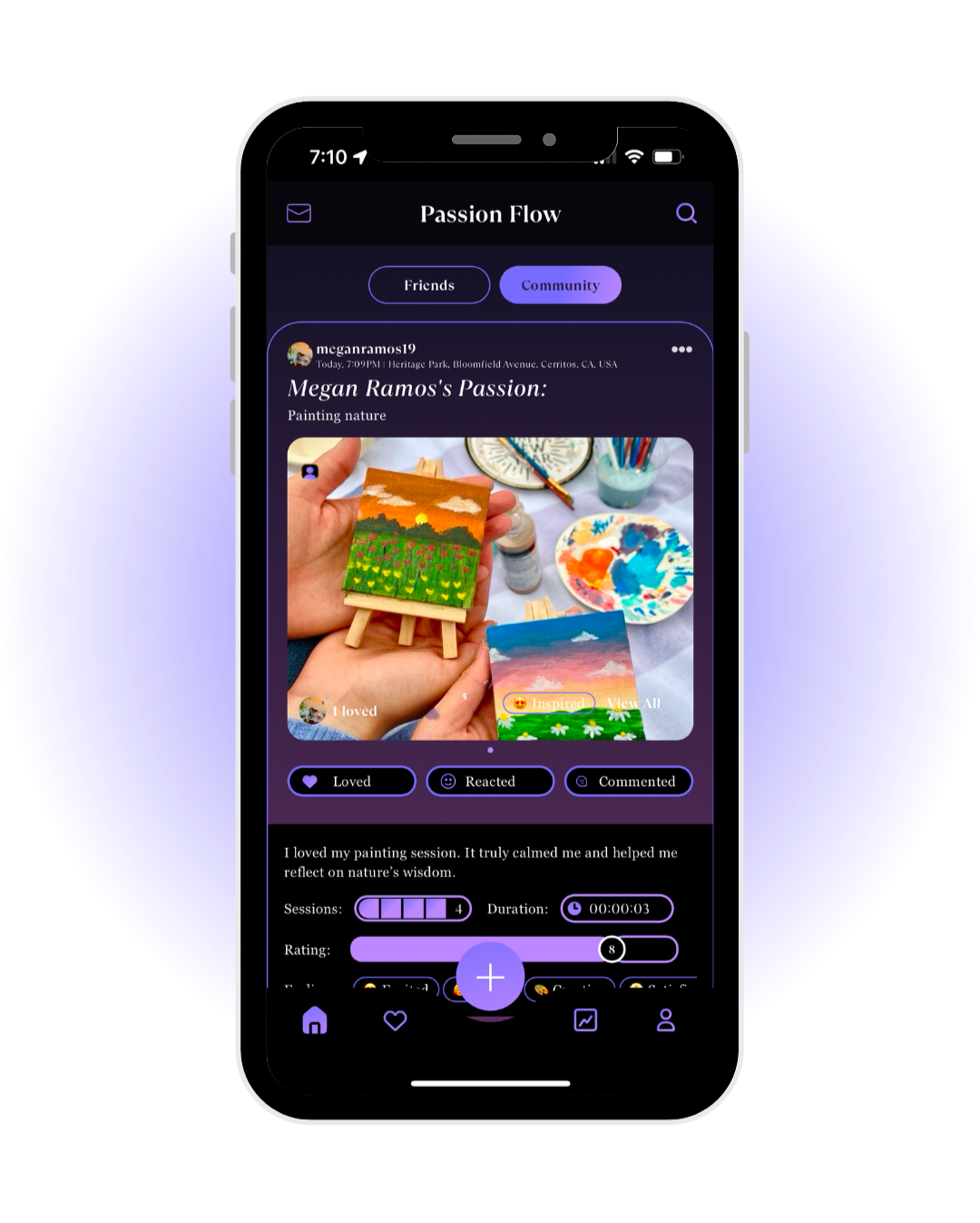 Capture your journey with prompts, images, or videos. Rate your flow state, track your feelings, and reflect on what the moment meant to you. Share with a community who honors every part of you.
